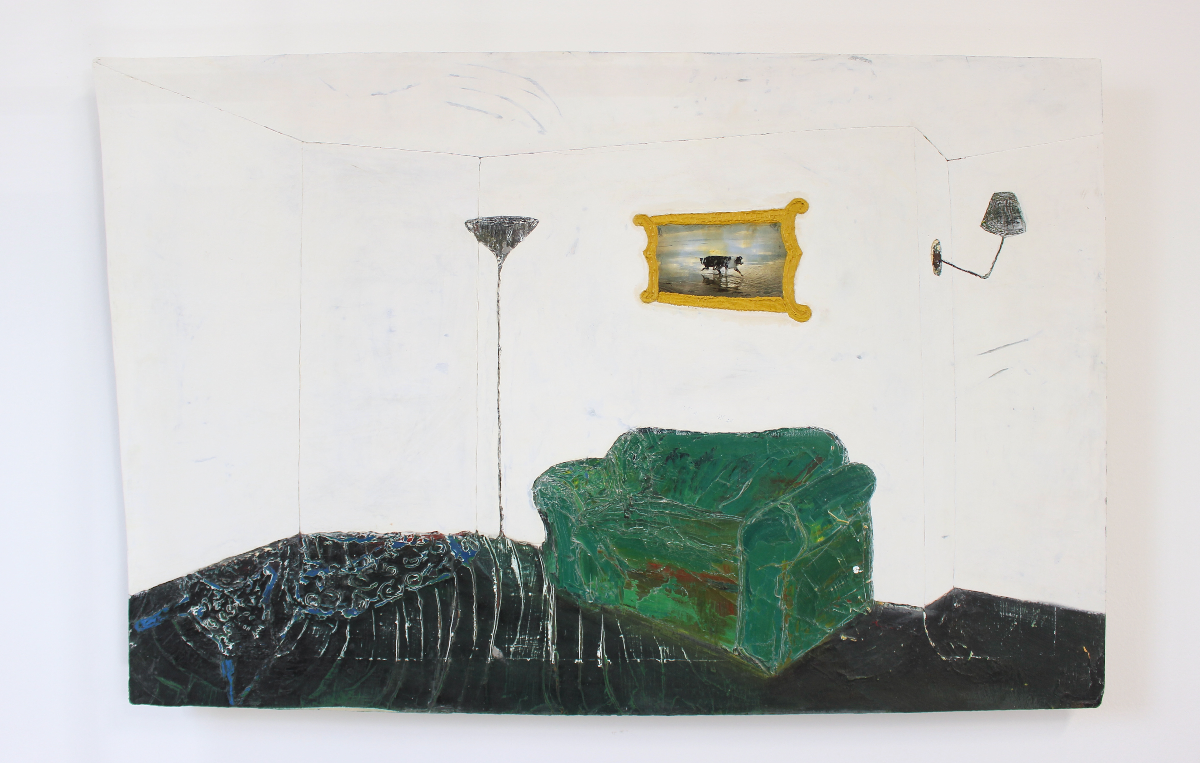 Oil, plaster and collage on found panel