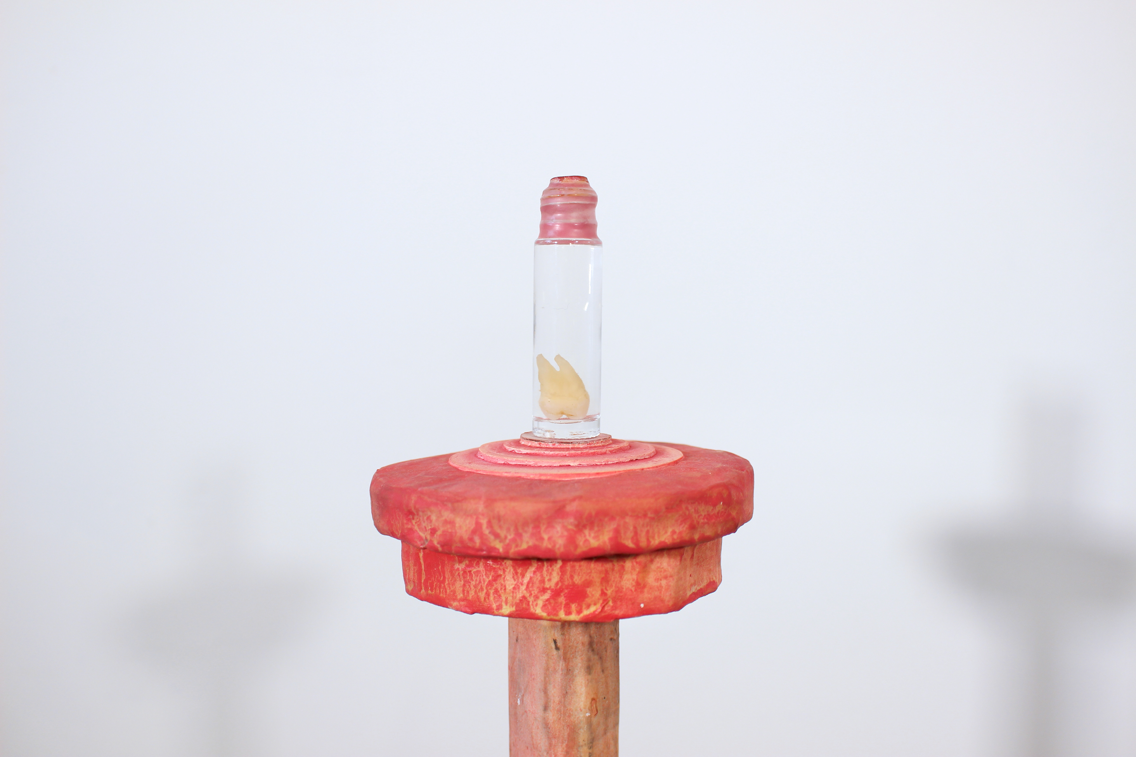 Paper pulp, cardboard, wire, paper mache, oil, plaster, glass jar, water, wood, beeswax and tooth