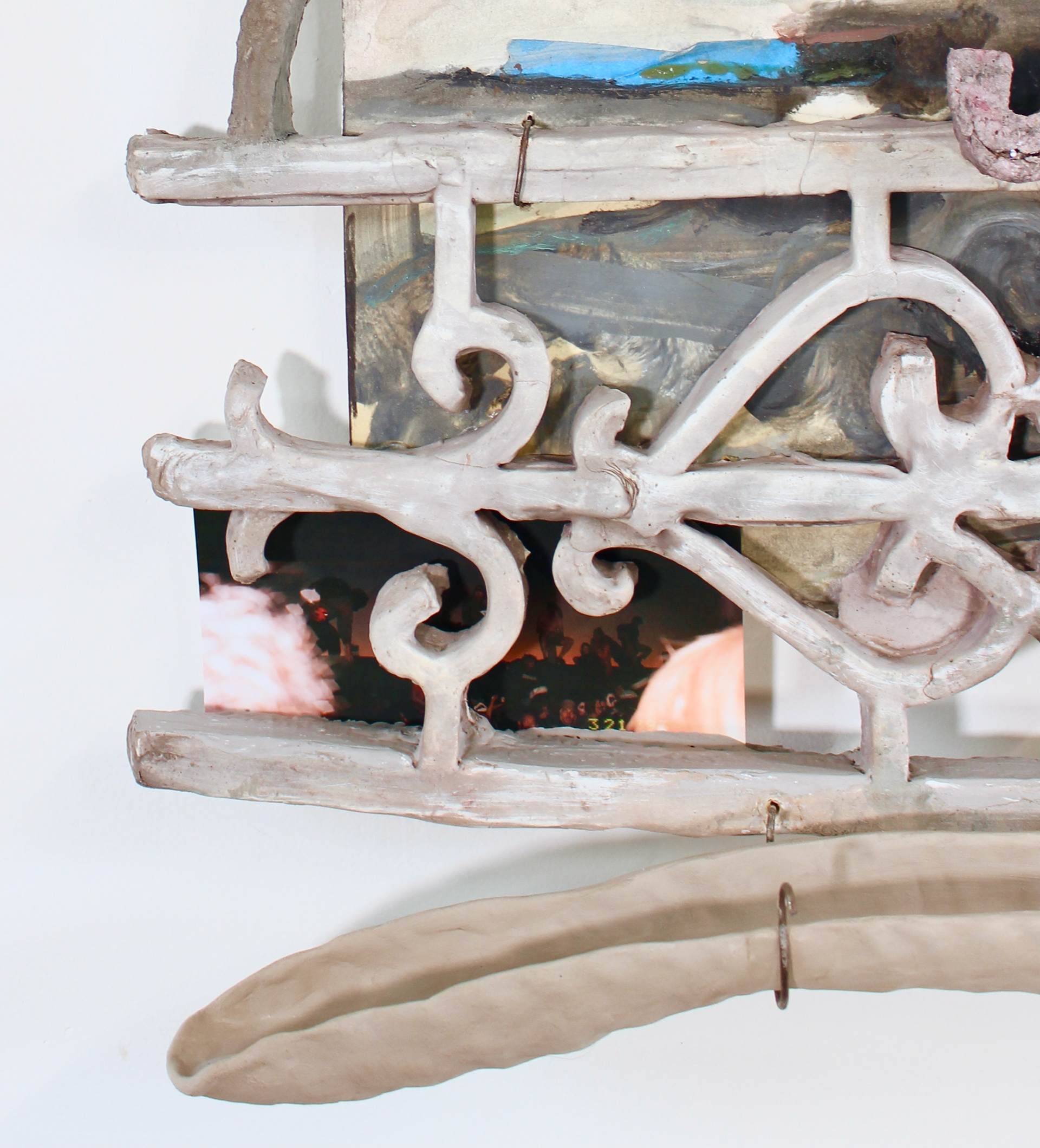 Oil, ink, glue, collage, wire and paper mache on found wood