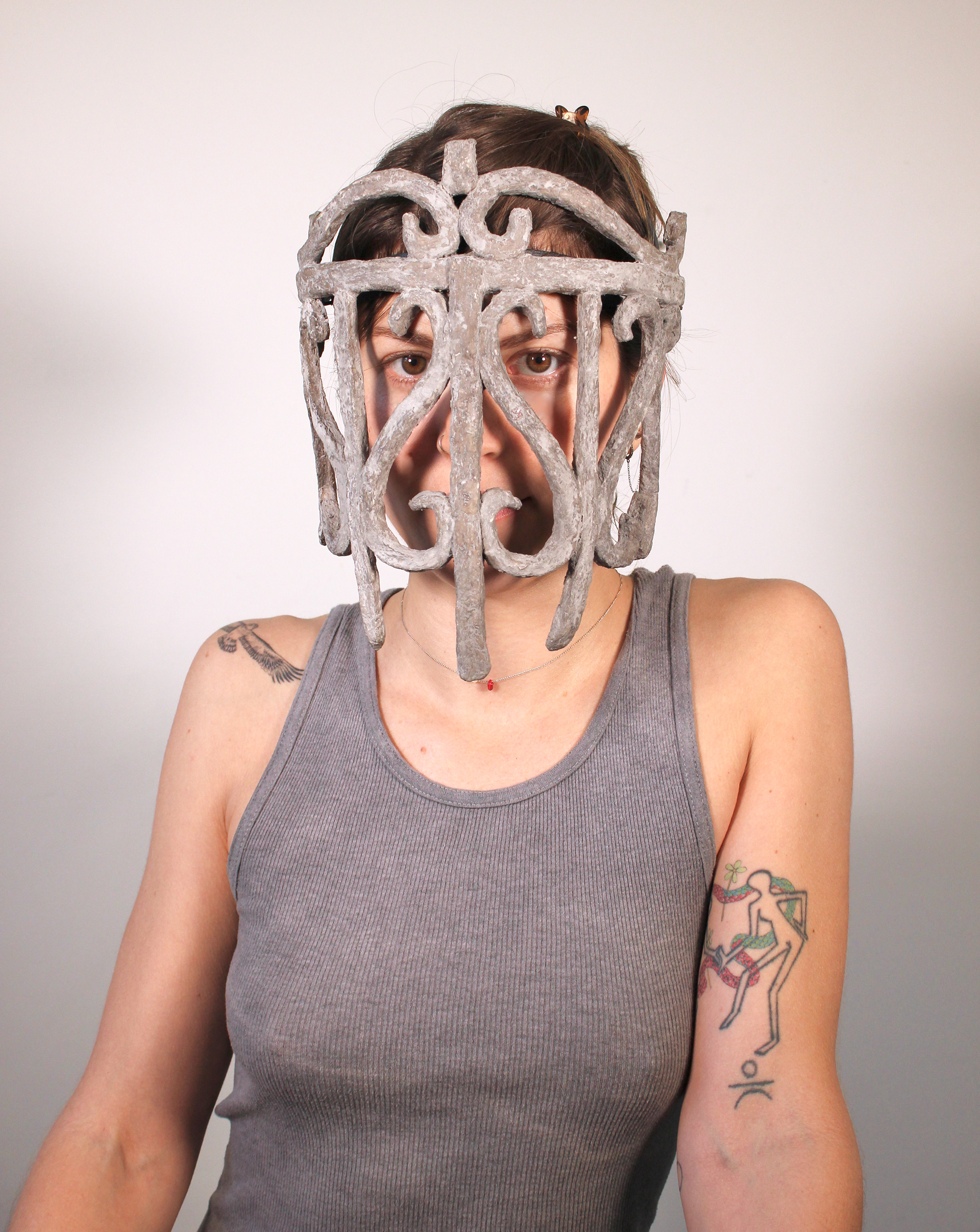 Chicken wire, paper mache, photographs, paper pulp, wire, clay, cardboard, plaster and ink