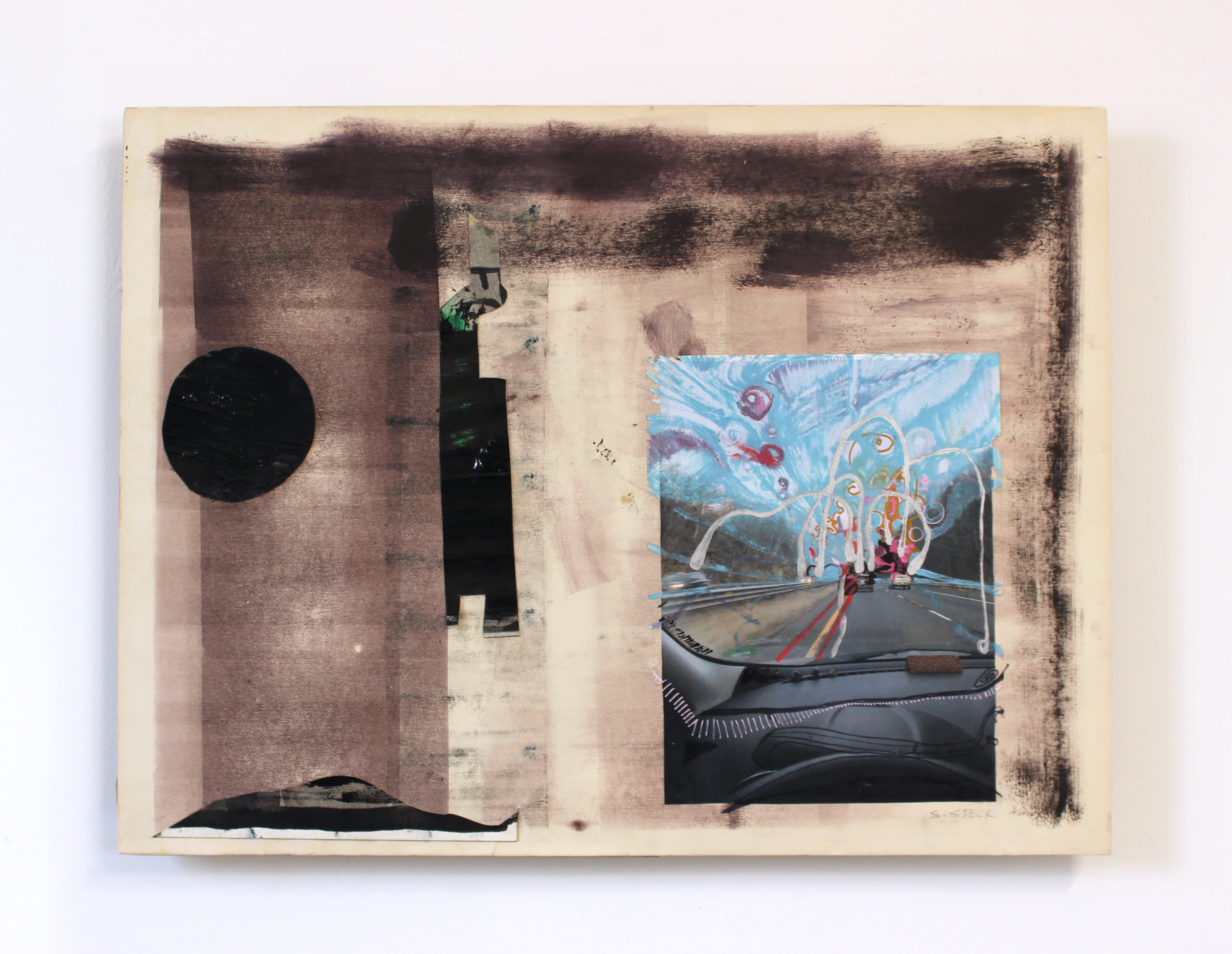 Ink, paint marker and collage on paper mounted on panel
