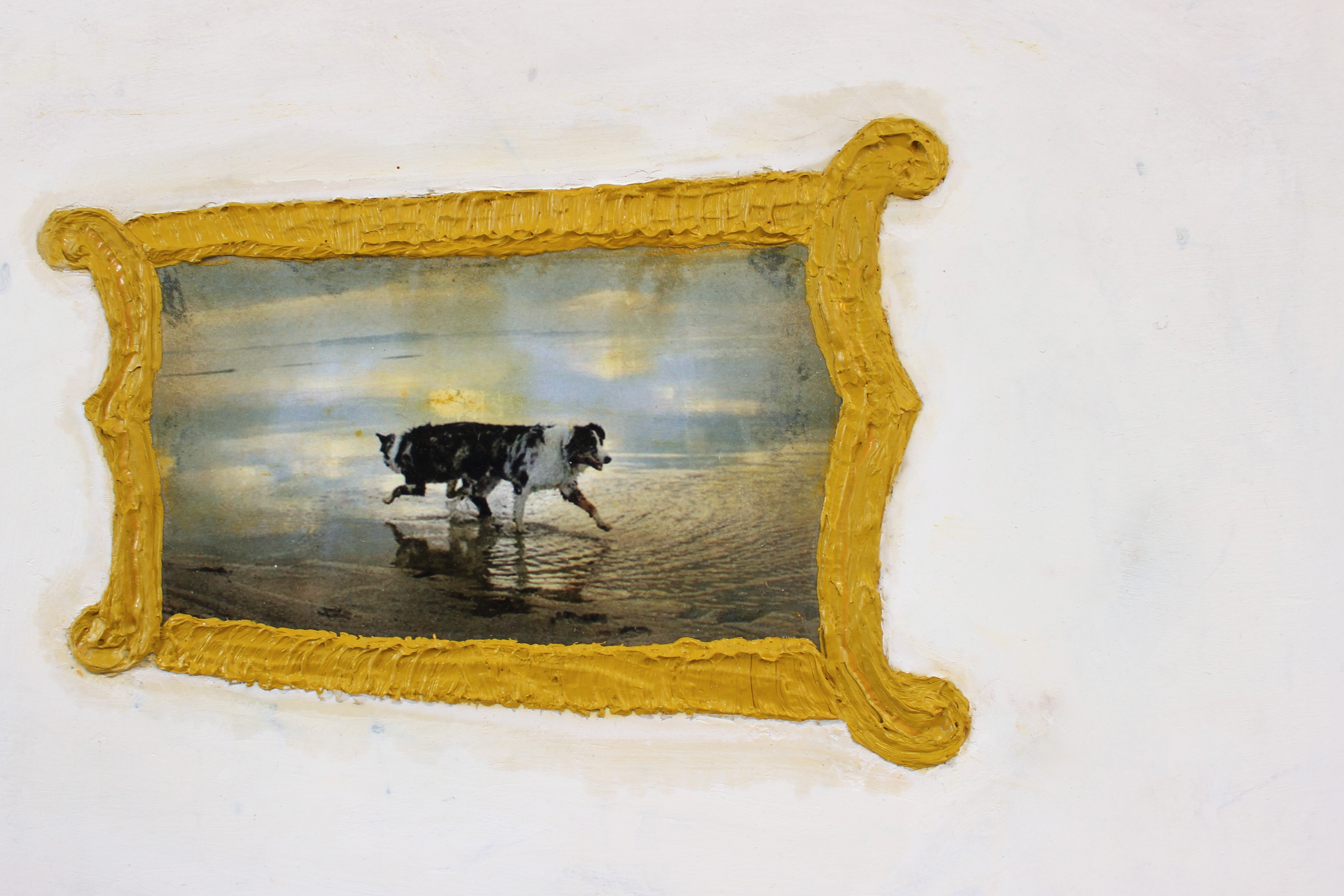 Pencil, oil, charcoal, wood and photograph on found roof hatch